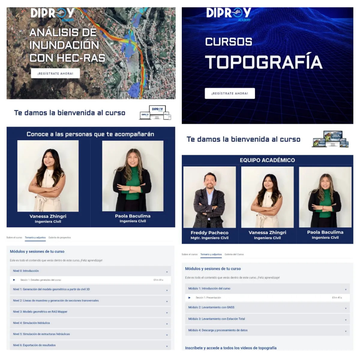 En Diproy Academy acompañamos a estudiantes y profesionales en su camino de aprendizaje y crecimiento. Ofrecemos cursos de topografía en modalidad virtual y presencial, así como capacitaciones en HEC-RAS, AutoCAD y más, con un enfoque práctico y fácil de entender. Queremos que adquieras habilidades reales desde el inicio, sin importar tu nivel de experiencia. Además, contamos con nuestra plataforma Skool, donde encontrarás todos nuestros cursos en un solo lugar para aprender a tu ritmo y desde cualquier lugar.